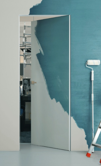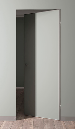 Скрытая дверь обратного открывания Инвизибл под покраску в скрытом коробе. Грунтованное покрытие для дальнейшего декорирования краской. Допустимо использование в помещениях с повышенной влажностью. Безопасно для здоровья и окружающей среды. Можно красить или клеить обои. Устанавливается вровень со стеной.