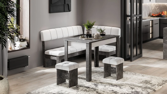 В состав входят: стол, угловая скамья и два табурета