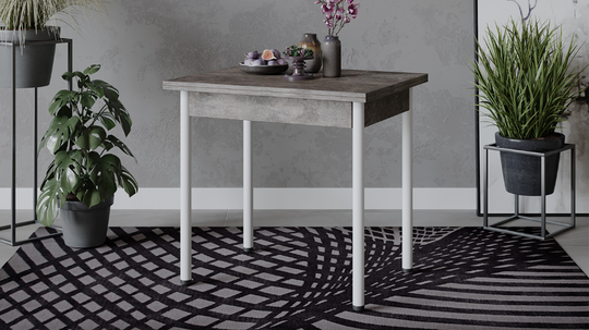 Стол имеет поворотно-раскладной механизм трансформации. Длина стола увеличивается вдвое: для этого нужно развернуть столешницу на 90 градусов и опустить верхнее крыло.