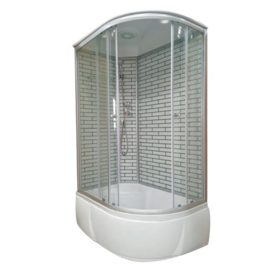 - Комплектация: поддон 42 см с бортиком, серебряный матовый профиль и дуги, верхний душ, ручной душ с держателем, стеклянная полка, стеклянная панель, смеситель.