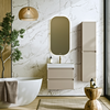 Тумба Aqwella Geometria 65 оснащена двумя выдвижными ящиками на направляющих скрытого монтажа, что обеспечивает плавное скольжение и мягкое закрывание. Фасады и боковины с обработкой торцов под углом 45 градусов создают лаконичность и изящный, почти монолитный силуэт в закрытом состоянии. Все грани имеют округлую фрезеровку, обеспечивая приятные тактильные ощущения при открывании. Внутри ящиков - отделка под светлый камень, боковины выполнены из толстого тонированного стекла, что добавляет коллекции элегантности.