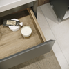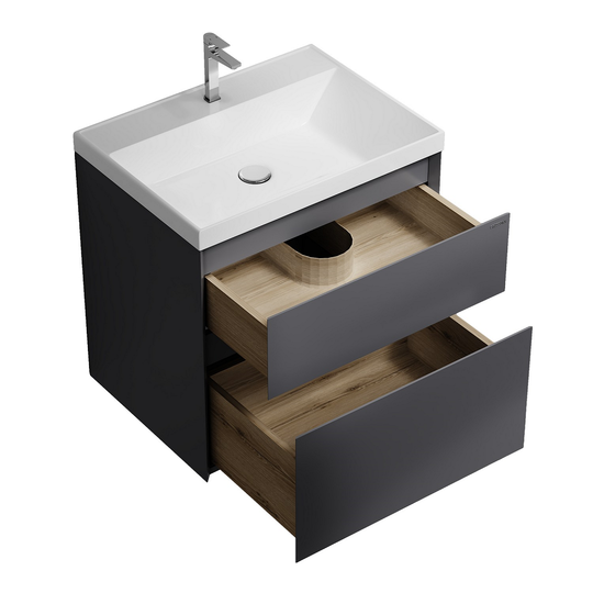 Подвесная тумба Меркадо 60 - современное и практичное решение для интерьеров в скандинавском и современном стиле. Корпус и фасады выполнены из МДФ в матовой краске в цвете графит. Фасады с точным запилом под 45° на торцах, что исключает видимую кромку и позволяет обходиться без ручек, создавая минималистичный и аккуратный дизайн. Два вместительных ящика изготовлены из ЛДСП «дуб Эльвезия» и оснащены направляющими скрытого монтажа с доводчиком, обеспечивающими плавное и бесшумное закрывание. Для надёжного крепления к стене предусмотрены подвесы в комплекте.