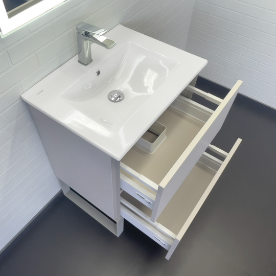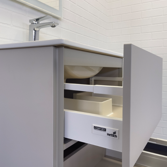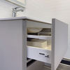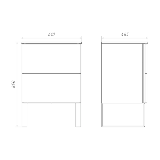 Напольная тумба с двумя ящиками, оборудованными направляющими с системой плавного закрывания. Открытие ящиков производится при помощи вертикальных профильных ручек, интегрированных в боковые стенки тумбы. Ножки тумбы из металла защищены от воздействия влаги порошковой покраской. Тумбу можно использовать как подвесную, если не использовать ножки. Материал фасада и боковых стенок: плита AGT - МДФ облицованный с двух сторон пленкой c эффектом soft touch.