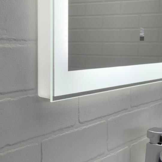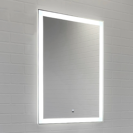 Высококачественное зеркальное полотно с амальгамой на основе серебра. Зеркало оснащено встроенным светодиодным светильником и бесконтактной кнопкой включения подсветки. Функция бесконтактного диммирования - регулирования яркости подсветки. Тип подсветки: фронтальная. Температура внутренней подсветки: 6500К, холодный свет. Зеркало для ванной комнаты с проводом длиной 1,3 м и вилкой подключения в сеть 220В. Задняя часть зеркала закрыта пластиковым кожухом.