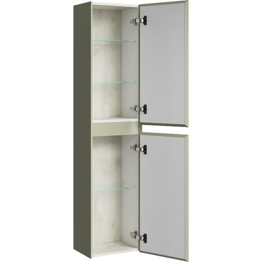 Пенал Aqwella Geometria 35 оснащен двумя дверцами на петлях с мягким закрыванием, внутри расположены полочки. Фасады и боковины с обработкой торцов под углом 45 градусов создают лаконичность и изящный, почти монолитный силуэт в закрытом состоянии. Все грани имеют округлую фрезеровку, обеспечивая приятные тактильные ощущения при открывании. Внутри - отделка под светлый камень.