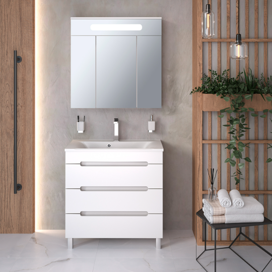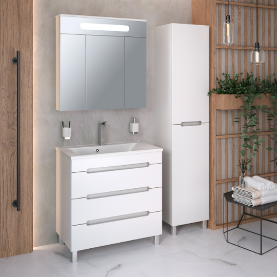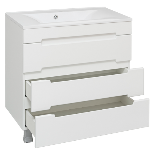 Тумба Olivia 80 оснащена тремя выдвижными ящиками на шариковых направляющих скрытого монтажа с доводчиками. Ящики легко открываются благодаря удобным вырезам на фасаде.