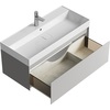 Тумба Aqwella Geometria 100 оснащена одним выдвижным ящиком на направляющих скрытого монтажа, что обеспечивает плавное скольжение и мягкое закрывание. Фасады и боковины с обработкой торцов под углом 45 градусов создают лаконичность и изящный, почти монолитный силуэт в закрытом состоянии. Все грани имеют округлую фрезеровку, обеспечивая приятные тактильные ощущения при открывании. Внутри ящиков - отделка под светлый камень, боковины выполнены из толстого тонированного стекла, что добавляет коллекции элегантности.