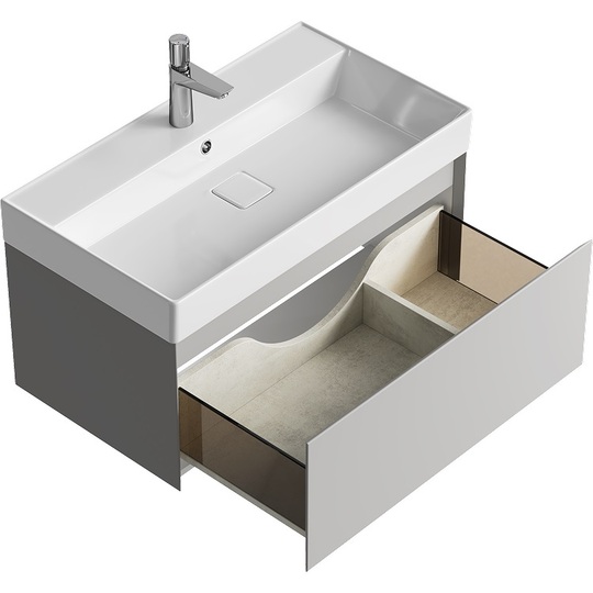 Тумба Aqwella Geometria 80 оснащена одним выдвижным ящиком на направляющих скрытого монтажа, что обеспечивает плавное скольжение и мягкое закрывание. Фасады и боковины с обработкой торцов под углом 45 градусов создают лаконичность и изящный, почти монолитный силуэт в закрытом состоянии. Все грани имеют округлую фрезеровку, обеспечивая приятные тактильные ощущения при открывании. Внутри ящиков - отделка под светлый камень, боковины выполнены из толстого тонированного стекла, что добавляет коллекции элегантности.