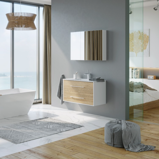 Подвесная тумба Aqwella Майами 100 оснащена двумя ящиками. Корпус тумбы из ЛДСП, окрашенного белой глянцевой эмалью. При изготовлении фасадов применяется технология нанесения кромки на ЛДСП с помощью лазера, что обеспечивает высокую влагостойкость мебели. Направляющие ящиков с функцией плавного и мягкого закрывания.