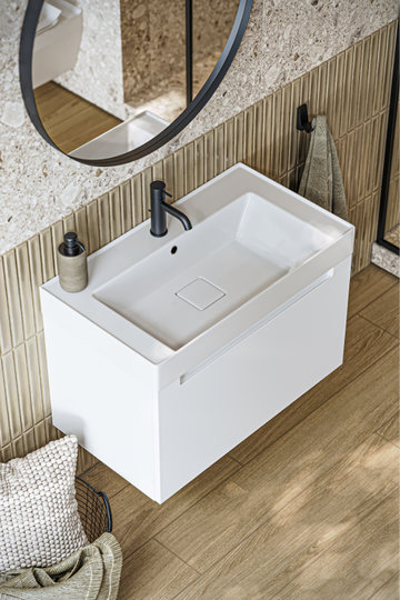 Подвесная тумба Ванкувер 81 оснащена одним ящиком с механизмом мягкого закрывания и тщательно организованным внутренним пространством с отделкой под дерево. Лаконичный фасад крашеный в белый цвет с интегрированной ручкой-зацепом подчеркивают чистоту форм и делают использование особенно удобным. Мебельный умывальник с декоративной вкладкой подчеркивает современный характер коллекции, а оптимальная глубина чаши обеспечивает комфортное ежедневное использование.