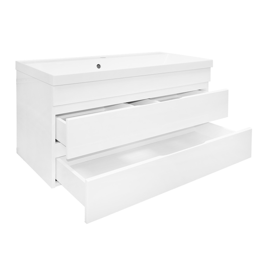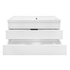 Тумба Эстима 100/2 оснащена двумя выдвижными ящиками на доводчиках скрытого монтажа. Корпус изготовлен из ЛДСП, фасады МДФ толщиной 16 мм. Корпус и фасады производства Kronospan. Бока и фасады крашеные итальянской эмалью.