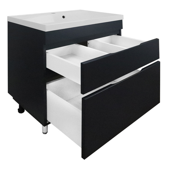 Тумба Эстима 70/2Н оснащена двумя выдвижными ящиками на доводчиках скрытого монтажа. Установлена на хромированные ножки. Корпус изготовлен из ЛДСП, фасады МДФ толщиной 16 мм. Корпус и фасады производства Kronospan. Бока и фасады крашеные итальянской эмалью.