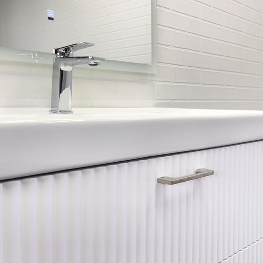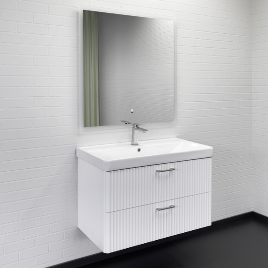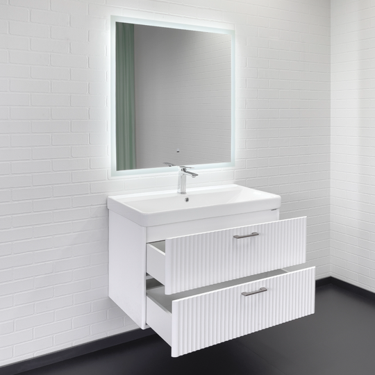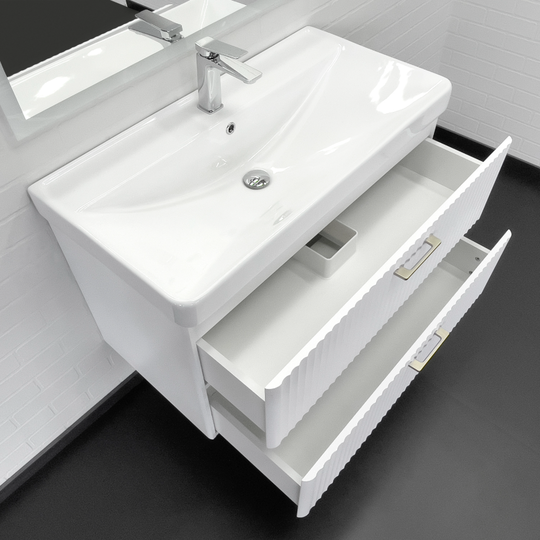 Тумба Comforty Ангара 90П оснащена двумя выдвижными ящиками с системой плавного закрывания. Фрезеровка фасадов выполнена в дорической форме. Внутренние детали тумбы выполнены из влагостойкого ЛДСП. Металлические ручки скобы под естественный хват цвета "жемчужный никель". Тумба подготовлена для подключения водоснабжения сзади и снизу.