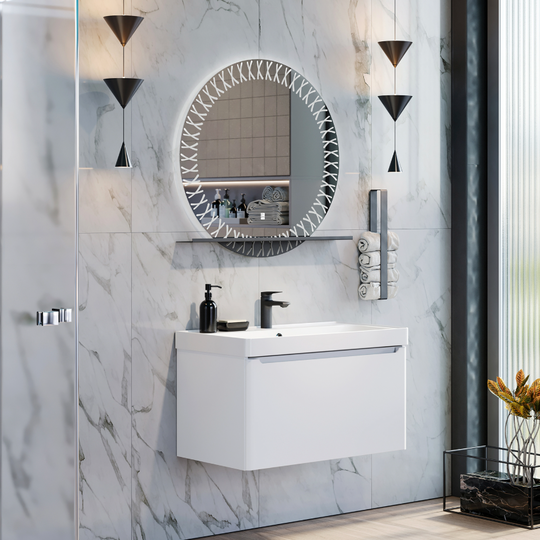 Подвесная тумба Comforty Арзамас 80-1 оснащена одним большим выдвижным ящиком. Направляющие оборудованы системой плавного закрывания. Лицевая фурнитура на фасад отсутствует, для открытия ящика нужно потянуть верхний край фасада, на котором сделан вырез под естественный хват. Тумба подготовлена для подключению коммуникаций снизу и сзади.