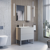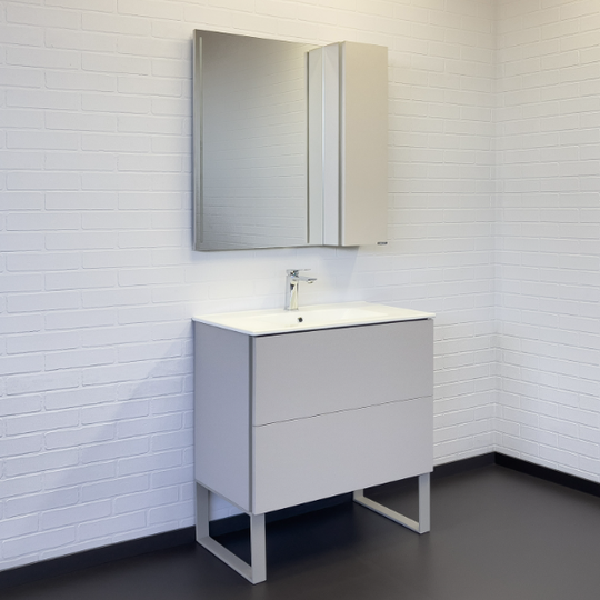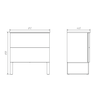 Напольная тумба с двумя ящиками, оборудованными направляющими с системой плавного закрывания. Открытие ящиков производится при помощи вертикальных профильных ручек, интегрированных в боковые стенки тумбы. Ножки тумбы из металла защищены от воздействия влаги порошковой покраской. Тумбу можно использовать как подвесную, если не использовать ножки.