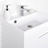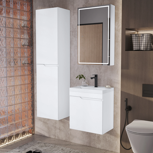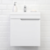Тумба Итана Alexa 50 покрыта ПВХ пленкой с высокой степенью глянца. Петли с доводчиками обеспечивают плавное открывание и закрывание дверцы. Ручки интегрированы в фасад, что исключает возможность случайного удара о фурнитуру.